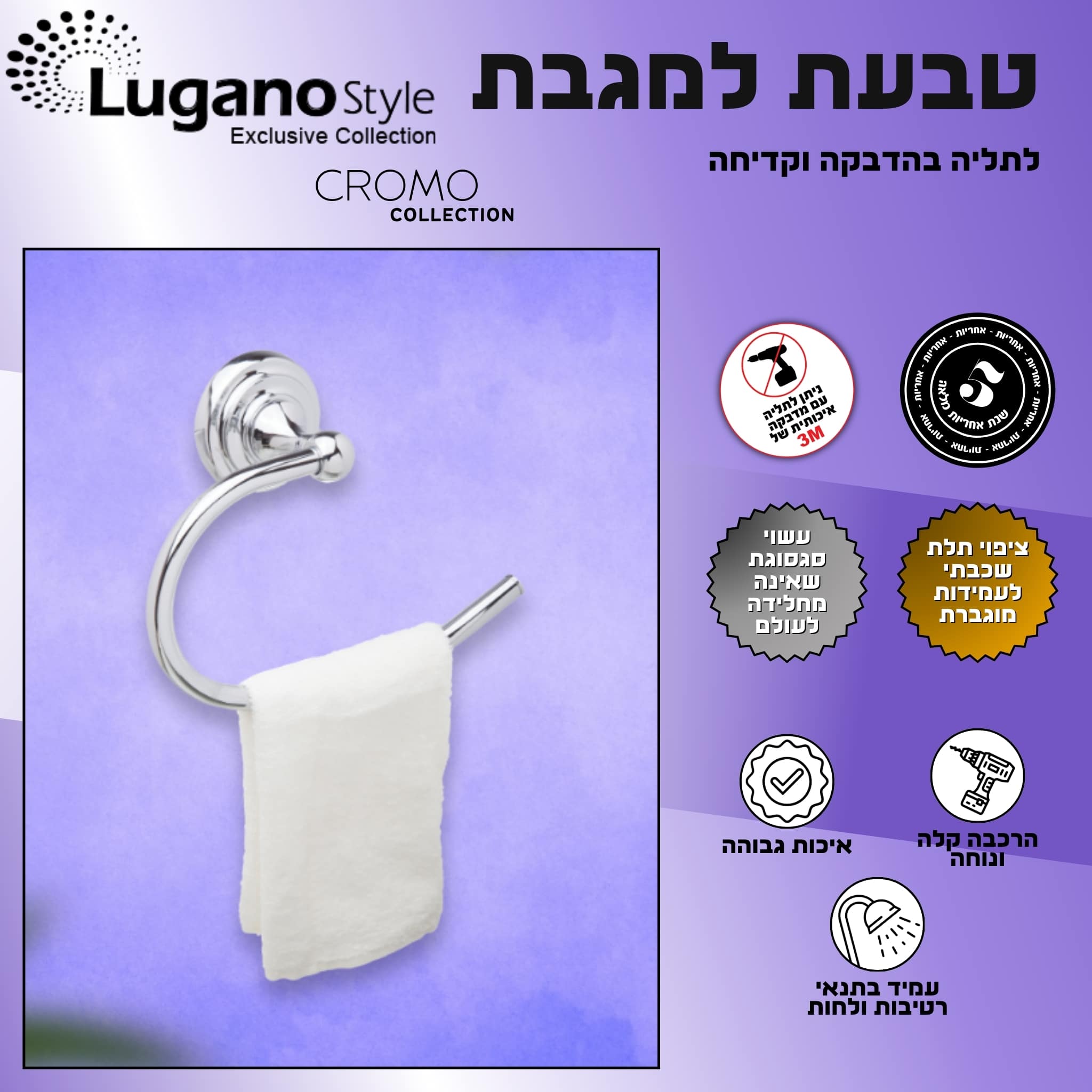טבעת למגבת – סדרת כרום. לתליה בהדבקה וקדיחה. – ניתן לתליה עם מדבקה איכותים של M3. – ציפוי תלת שכבתי לעמידות מוגברת – עשוי סגסוגת שאינה מחלידה לעולם. – הרכבה קלה ונוחה. – עמיד בתנאי רטיבות ולחות. – איכות גבוהה....קרא עוד