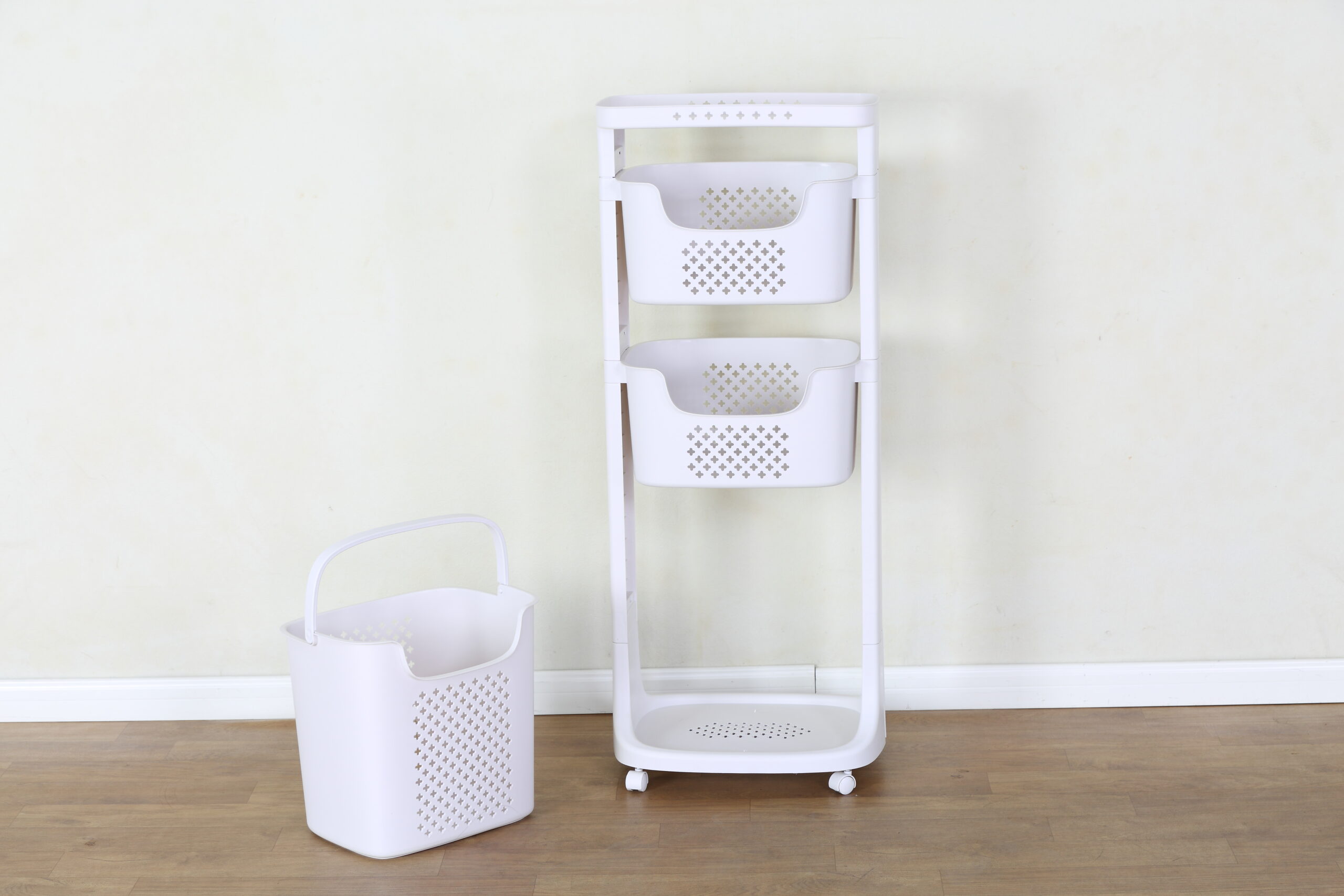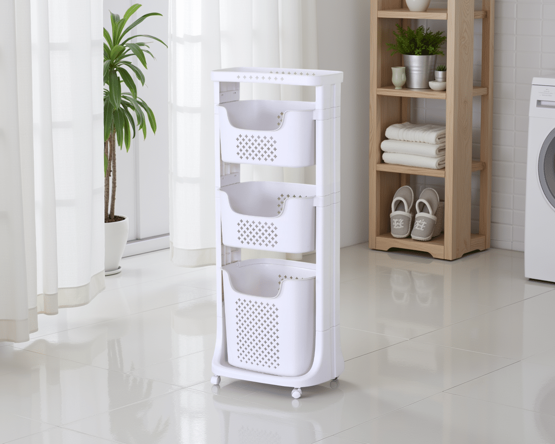 מעמד סל כביסה 3 קומות מידות: 43.5*34.5*106.5 • שלדה חזקה ועמידה • מיוצר מפלסטיק קשיח וקל במיוחד • כולל גלגלים להזזה נוחה • סל תחתון נשלף