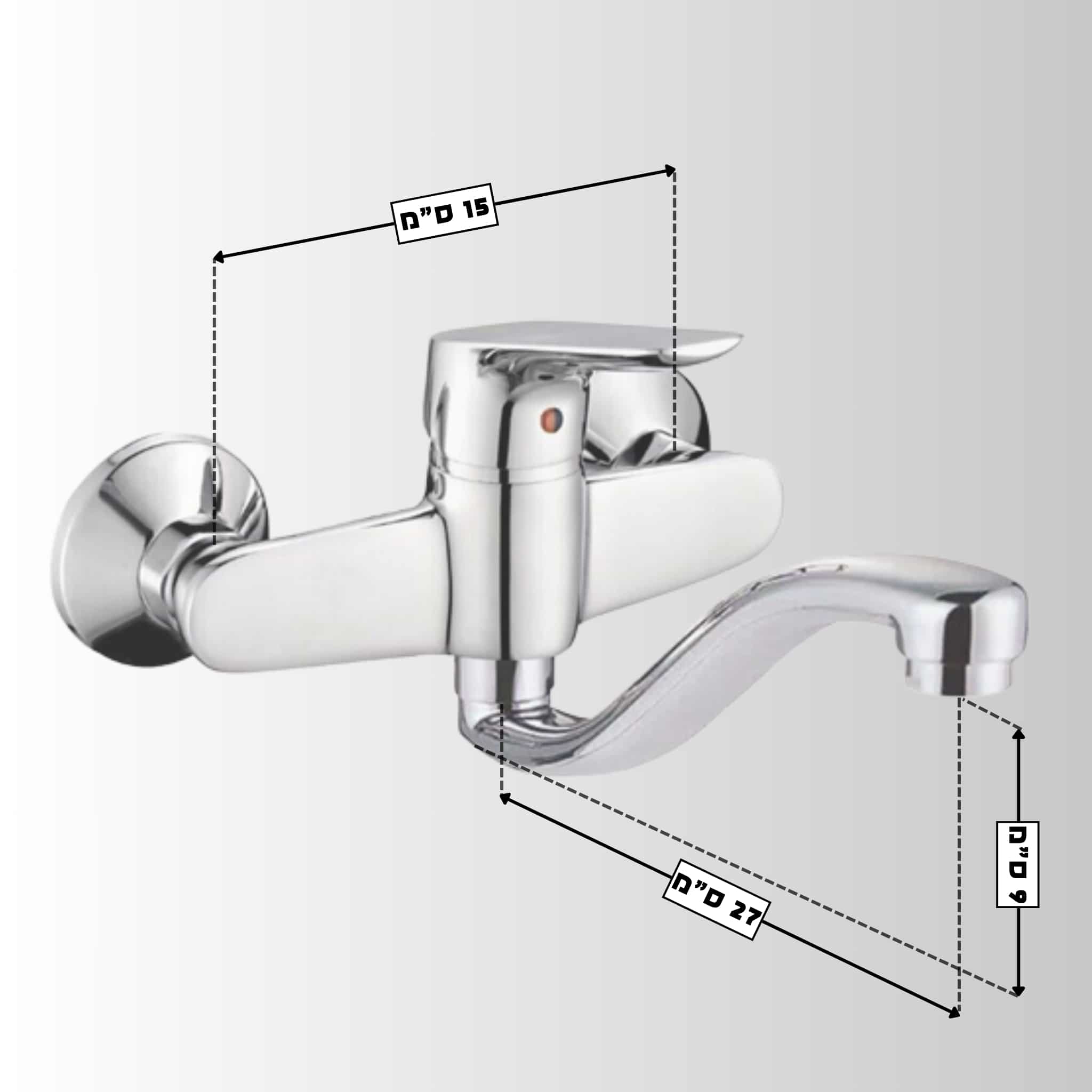 סוללת קיר עם פייה תחתונה קשתית בינונית – כרום. גימור: כרום. מידות: מרחק בין הבסיסים: 15 ס"מ. גובה פייה: 9 ס"מ. עומק פייה: 27 ס"מ.
