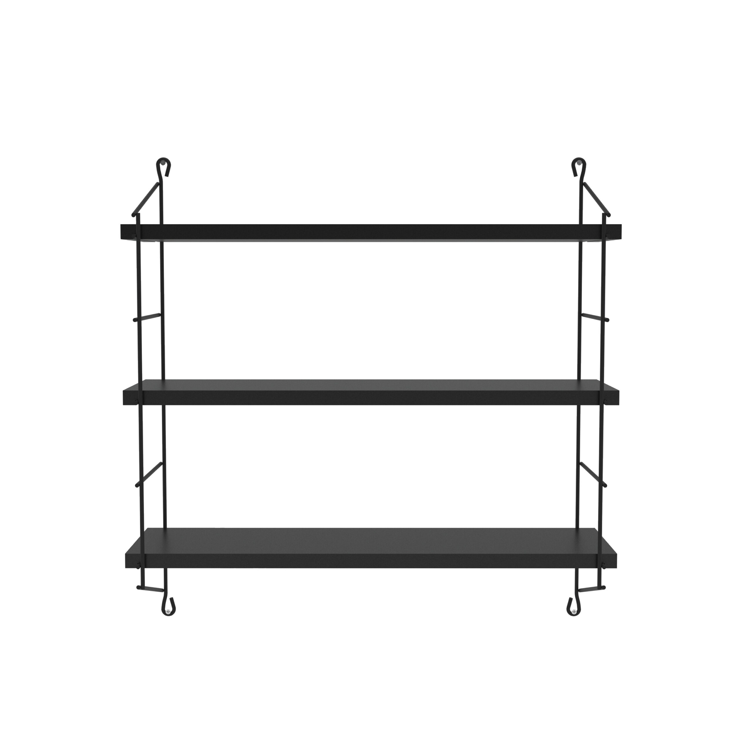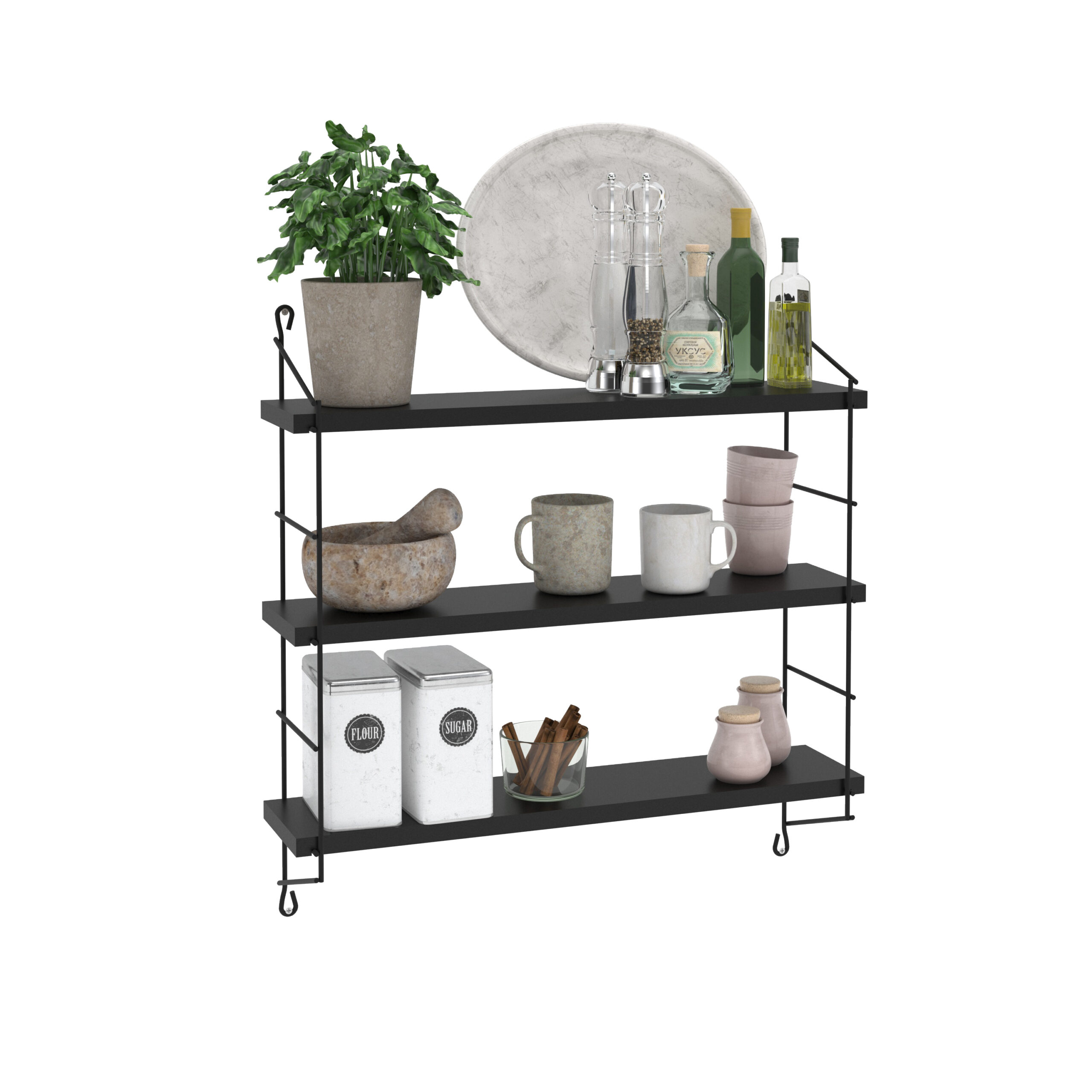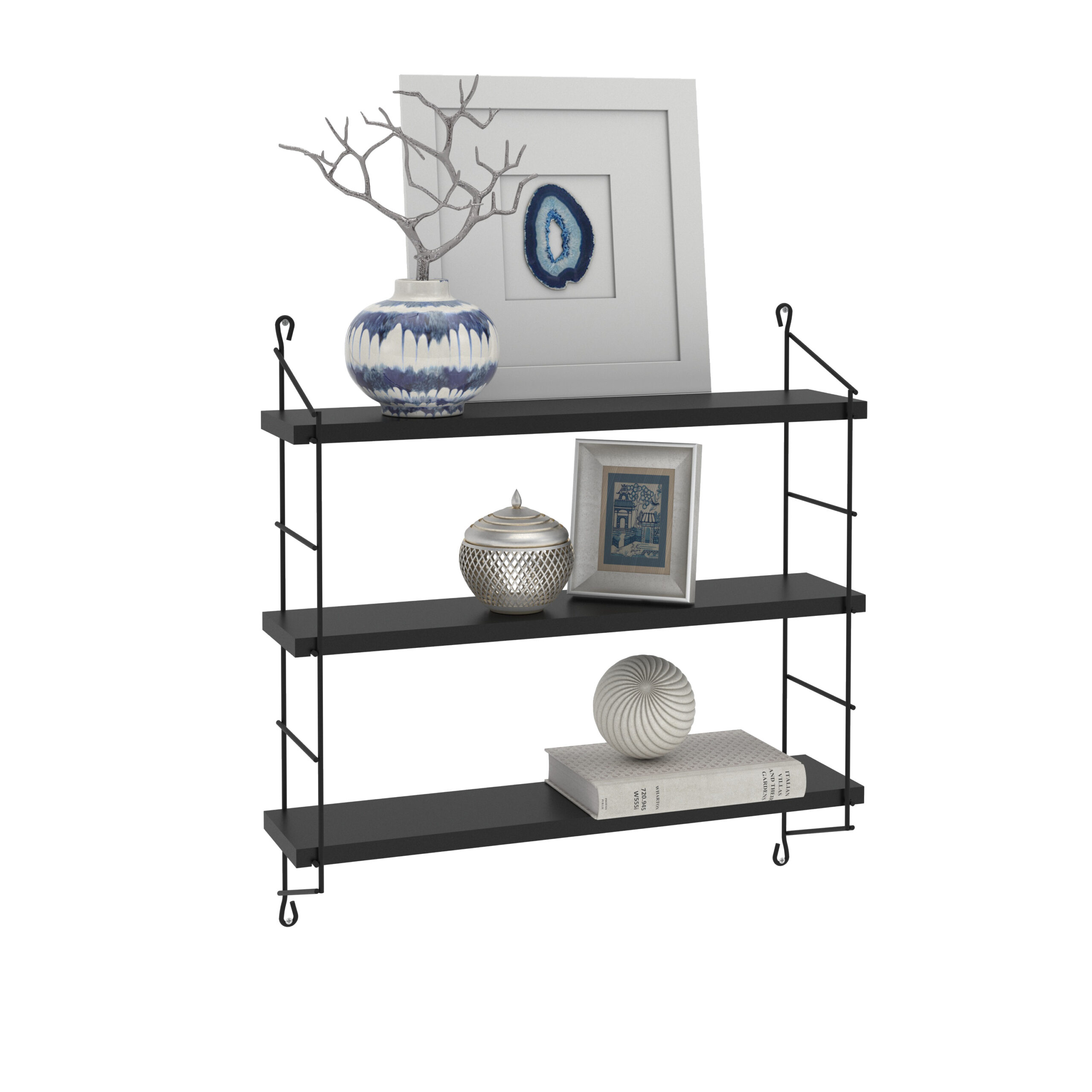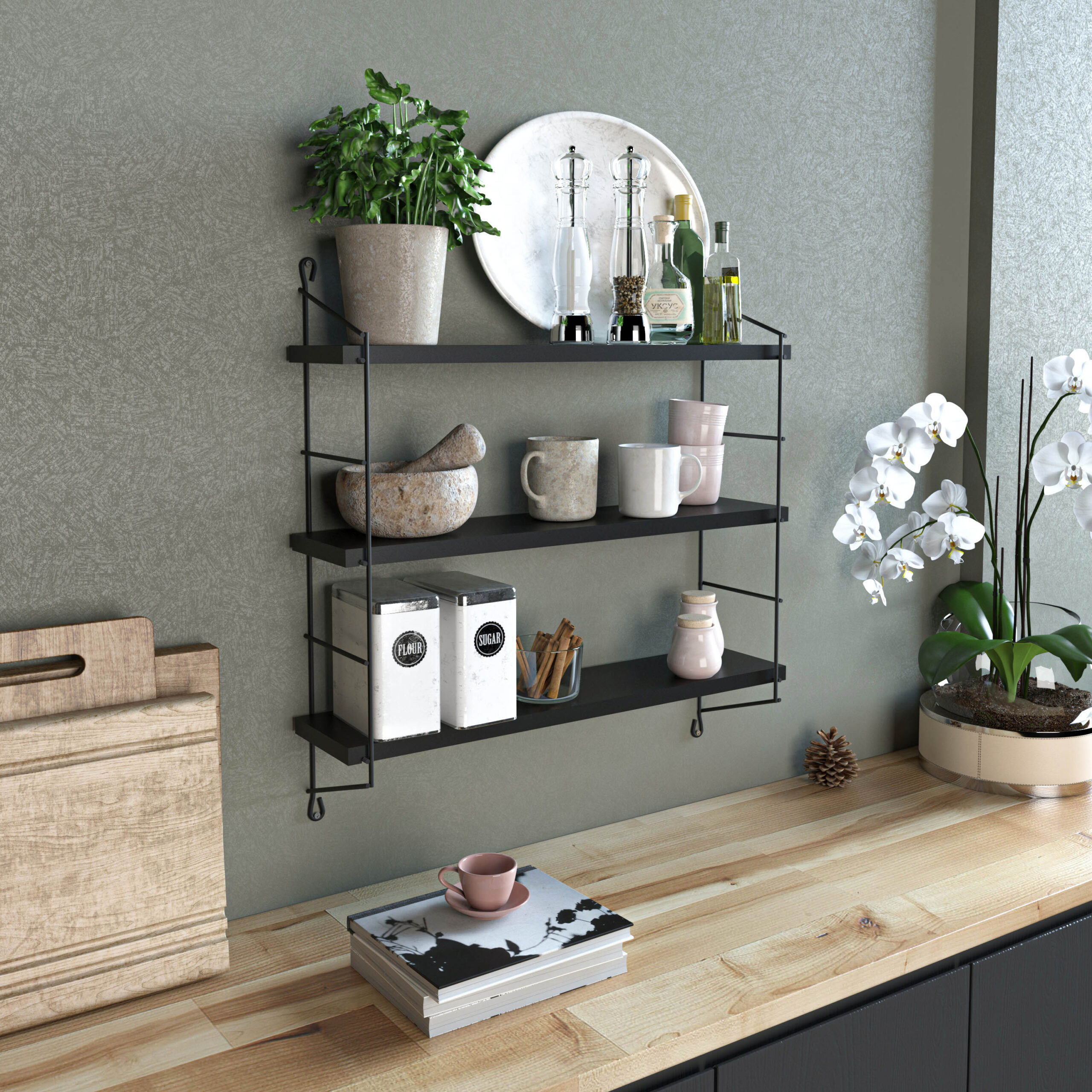 שלישיית מדפי עץ שחורים עם תליה מעוצבת מברזל צבע שחור