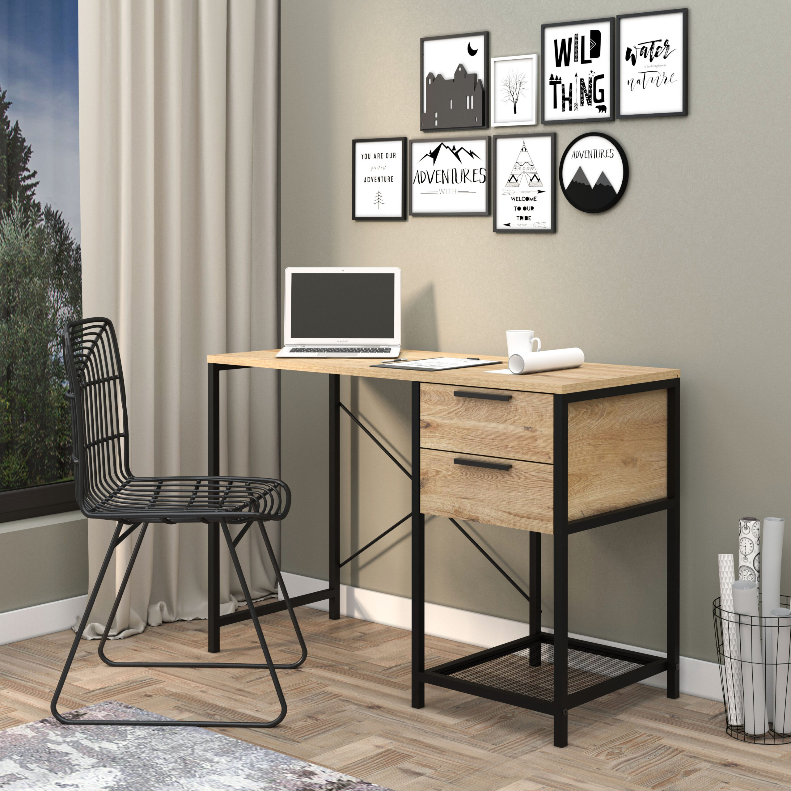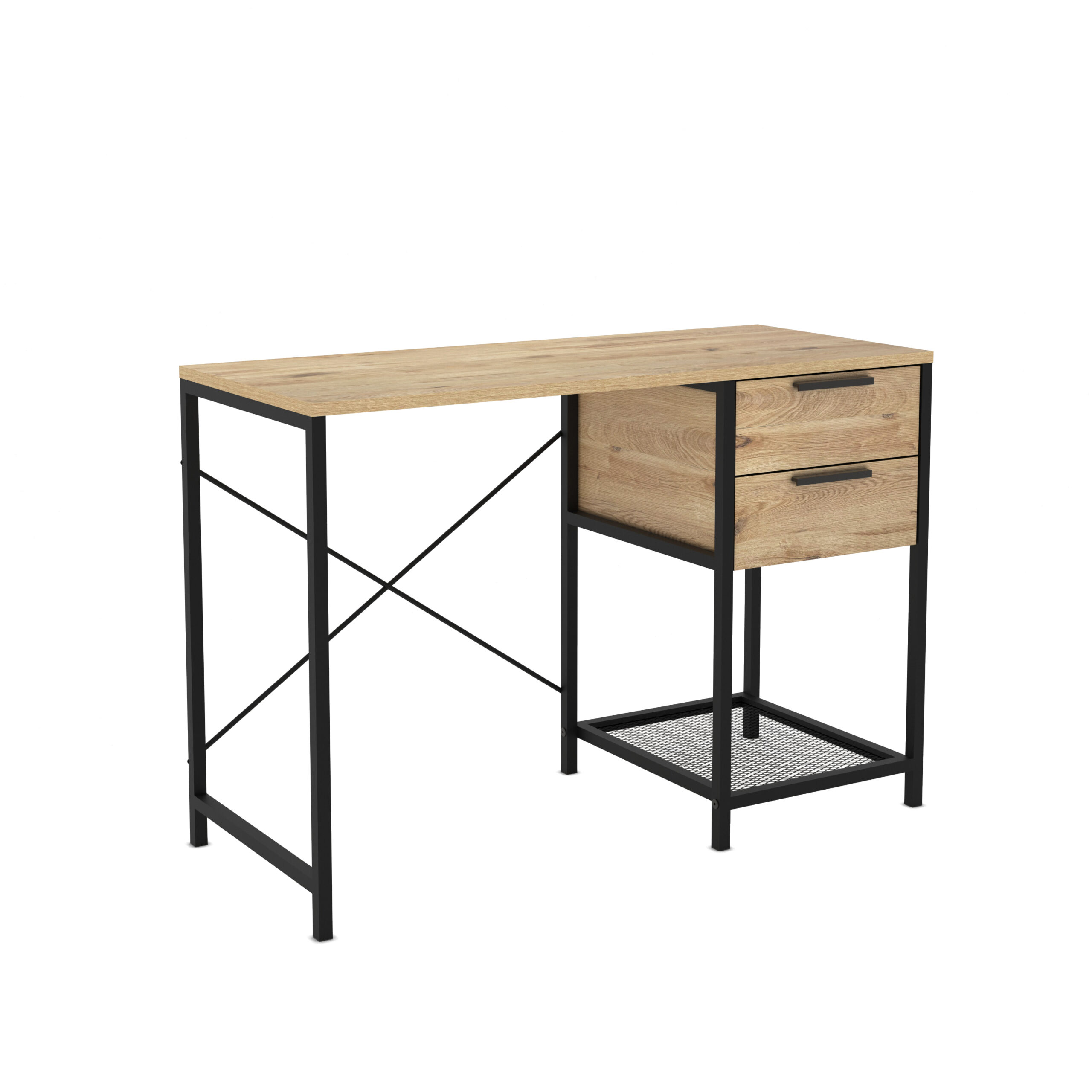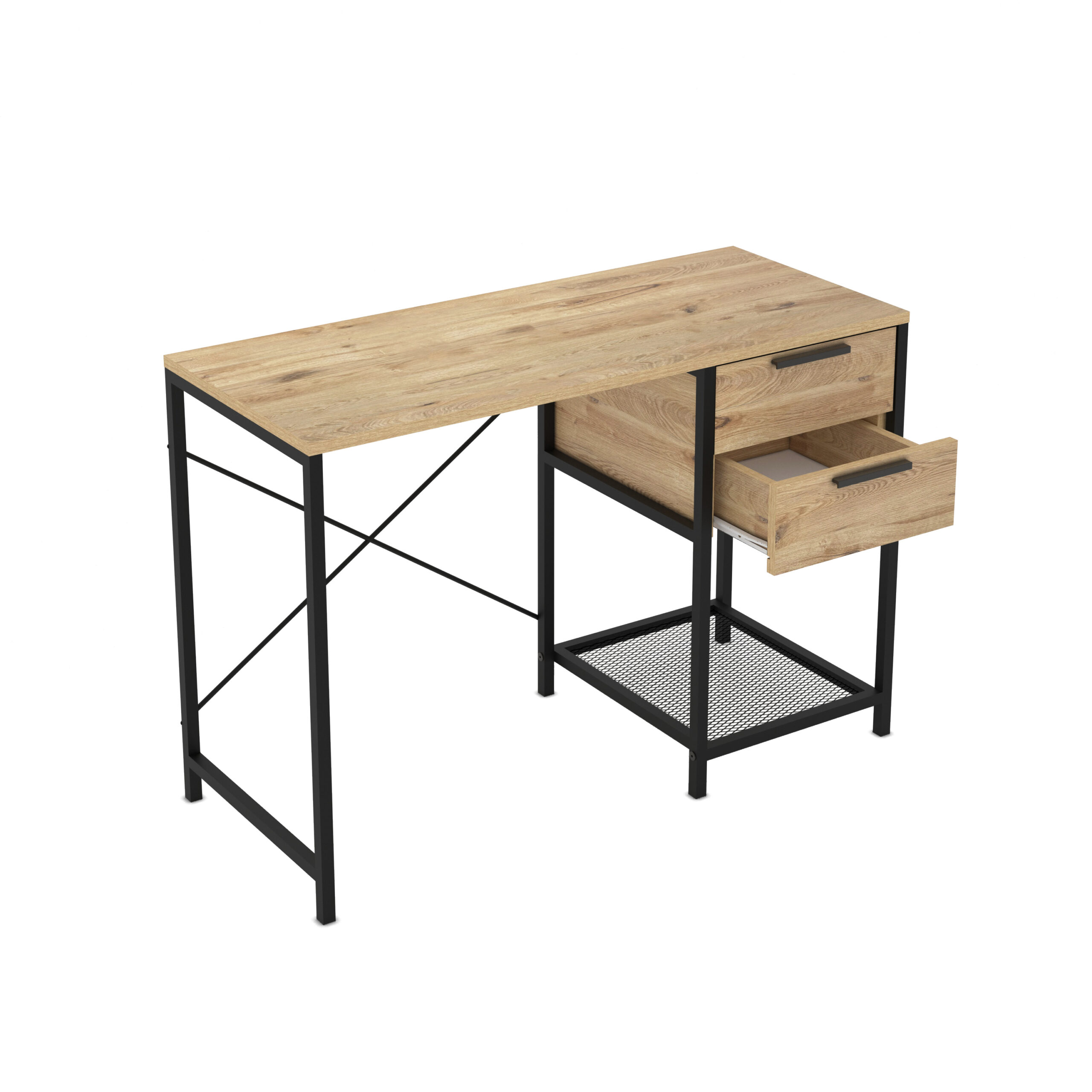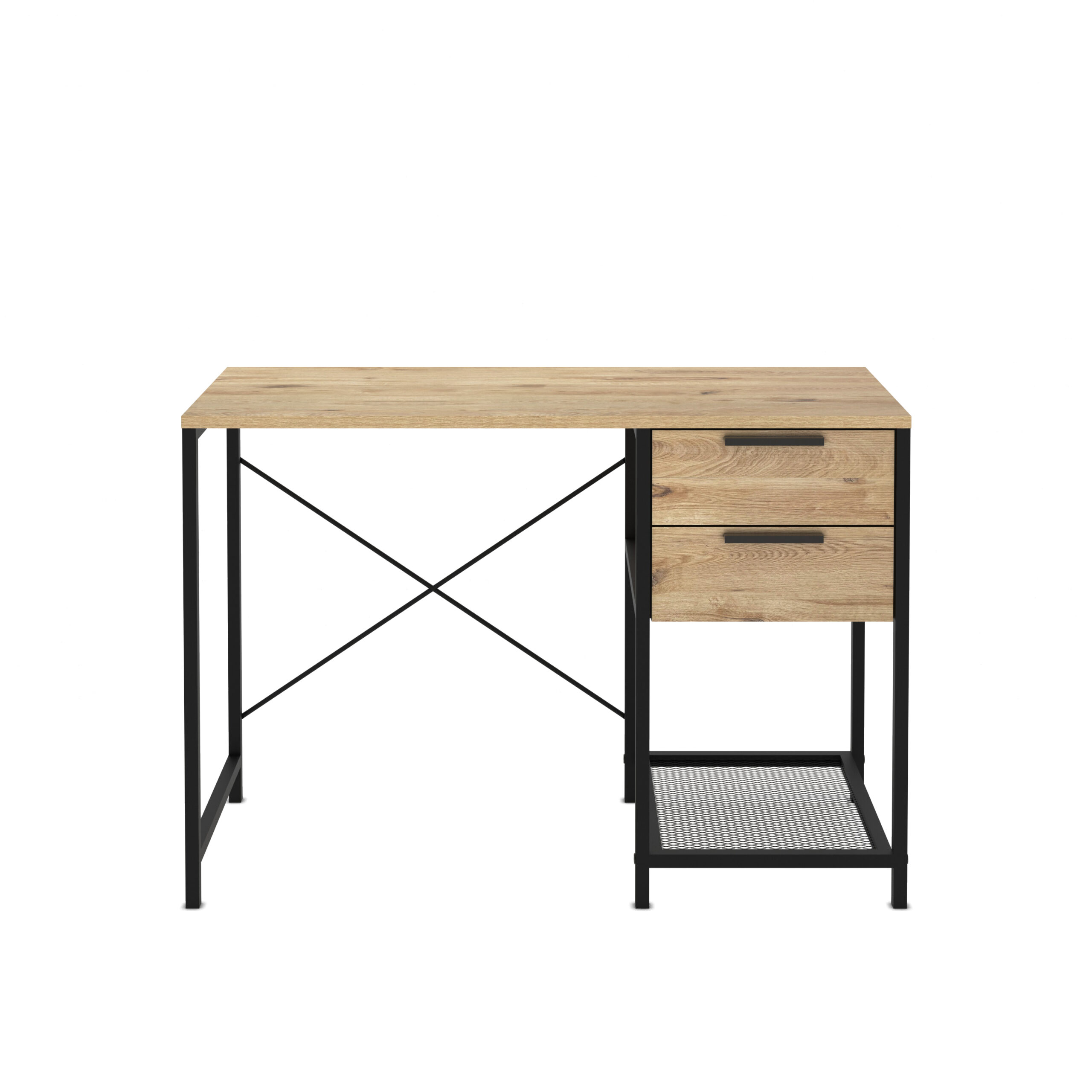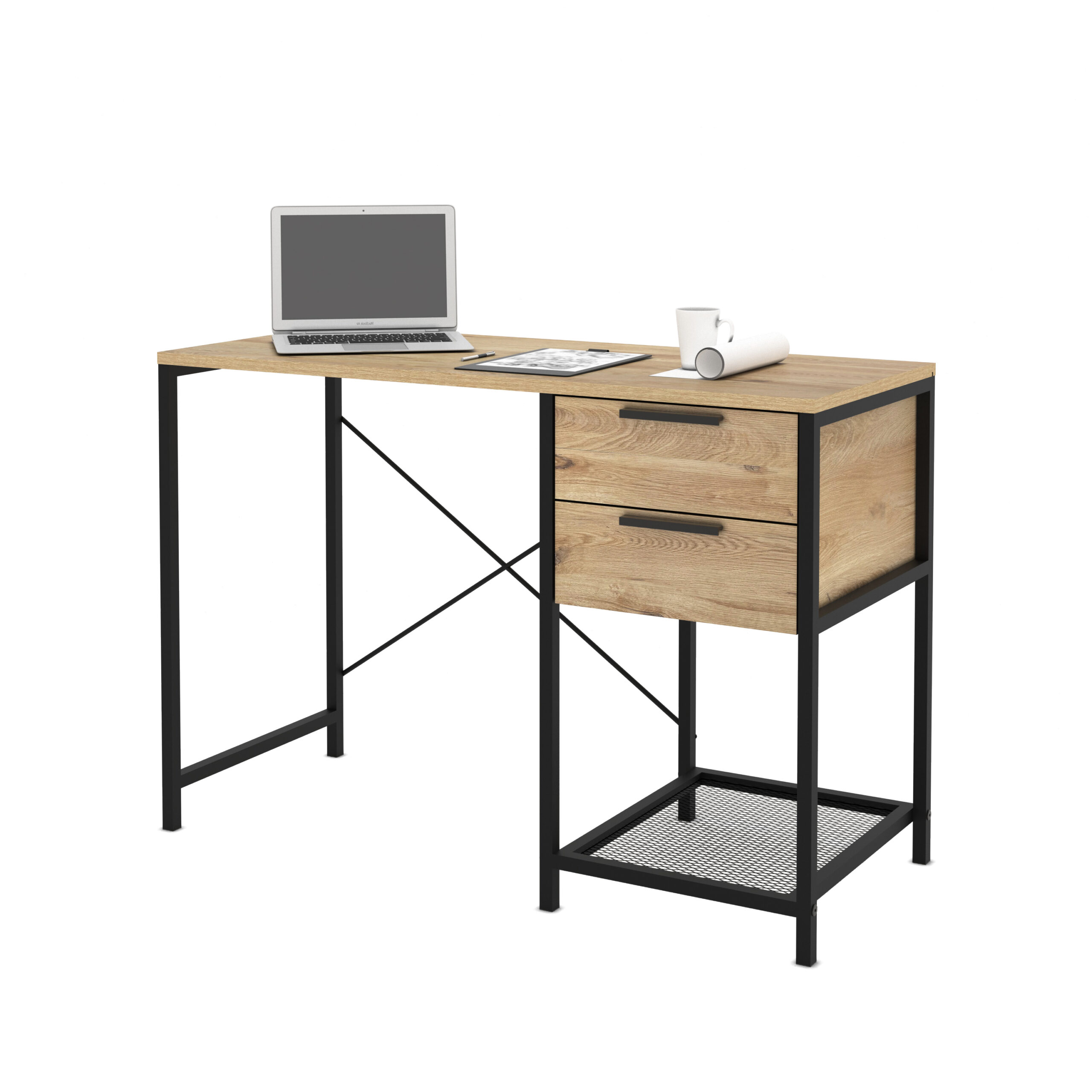 שולחן כתיבה מעוצב מעץ עם 2 מגירות שולחן עבודה כתיבה עם 2 מגירות ומדף רשת תחתון שימושי, אידיאלי לתלמיד או סטודנט. קלאסי לעבודה עם לפטופ – יציב מאוד, נעים במגע ופונקציונאלי להפליא. עיצוב מודרני בשילוב מתכת שחורה עם מגירות ופלטה...קרא עוד